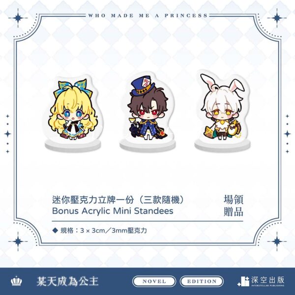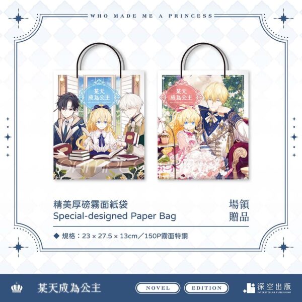 凡於「深空出版」官網預購《某天成為公主01小說豪華特裝版》或《某天成為公主01+02漫畫豪華特裝版》,且領取方式選擇「2023漫博攤位場領」者,可額外獲得【壓克力迷你立牌一份(三款隨機)】,及【精美霧P紙袋一份】。