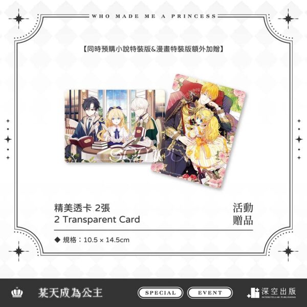 Pre-order “Who Made Me A Princess? Vol.1 Novel Special Edition” and “Who Made Me A Princess? Vol.1+2 Comic Special Edition” together on the official website of Interstellar Publishing, and get 1 bonus Transparent Card!