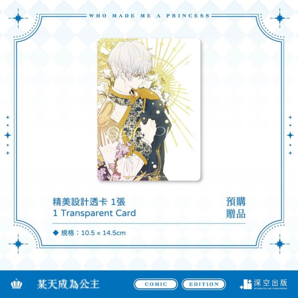 Pre-order “Who Made Me A Princess? Vol.2 Novel Special Edition” and “Who Made Me A Princess? Vol.3+4 Comic Special Edition” together on the official website of Interstellar Publishing, and get 1 bonus Transparent Card!