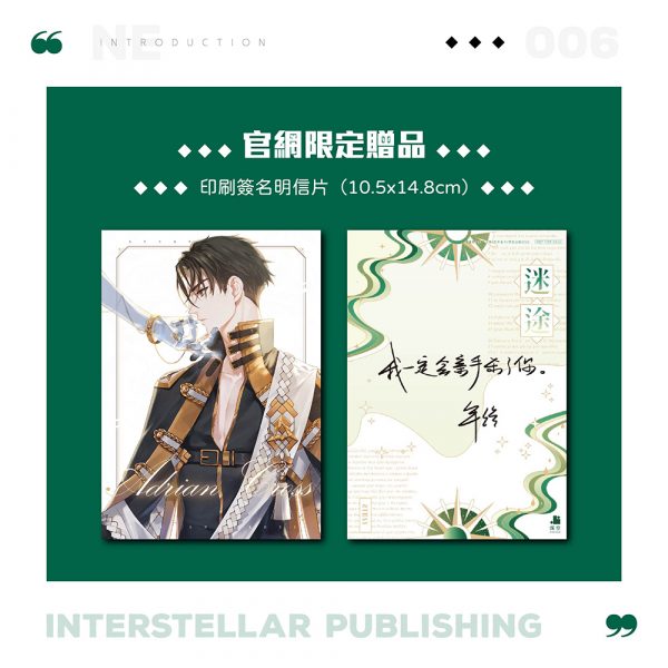 ▶ 購書連結:博客來/誠品書店/墊腳石/金石堂   即將踏平深淵的溫柔騎士╳注定毀滅地表的俊美魔物 無可抵禦的絕望,撕裂現實。 而他們,能否再次擁抱光明?   ◆ 知名耽美作者「年終」西方奇幻史詩鉅作 ◆ 作者全新修訂並收錄加筆番外〈親吻〉 ◆ 華麗絕美雙書封隆重呈獻   ❖ 官網獨家贈品 ❖ ❏ 精美印簽明信片(10.5x14.8cm) ※ 數量有限,送完為止。   ※ 因印製、包裝、寄送等原因,商品和書籍無法保證完美無瑕,若您對於書籍或商品本身的完美度有要求,請勿購買,書籍和商品非嚴重撞角等不影響閱讀使用之瑕疵恕不更換。 ※ 購買商品前,請詳閱【購物須知】等相關售後服務規定,瑕疵判定請依客服人員判斷為準。