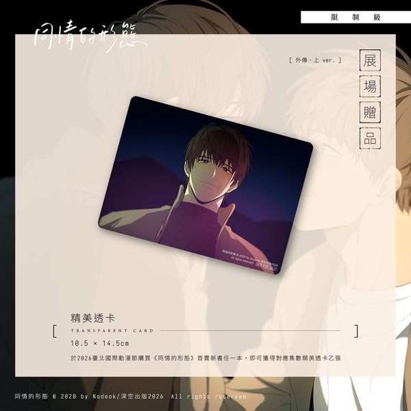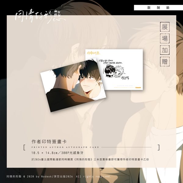 ▶ 展場加碼──購買《同情的形態》系列【外傳.上+下】&【後日談】,即贈【作者印特簽畫卡】乙份(可累贈)